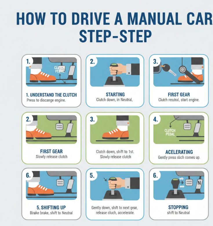 Mastering how to drive a manual car is a journey that rewards patience, awareness, and practice. From beginner basics to smooth traffic handling, manual driving builds stronger vehicle control and deeper road confidence. With consistent practice and calm focus, manual driving becomes second nature and an empowering skill for any driver.