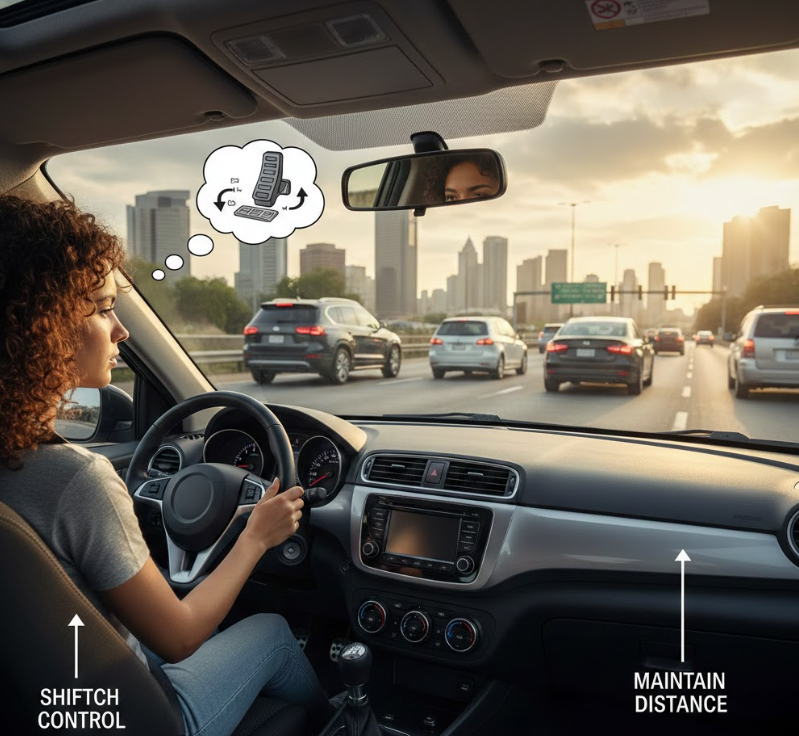 Manual driving demands multitasking. Awareness of surroundings prevents rushed shifts. Calm observation improves control.