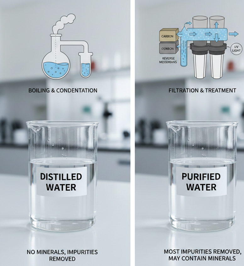 Choosing between distilled and purified water depends on the application. Purified water may retain some beneficial minerals, while distilled water is ideal when complete mineral removal is required.